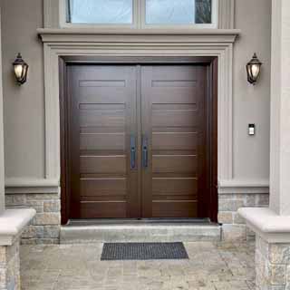 Double doors provide a wide and grand entrance, often featuring symmetrical panels. They are practical for moving large items while adding style to any property.